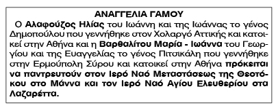 Αναγγελία Γάμου Αλαφούζος - Βαρθαλίτου Δευτέρα 14 Μαΐου 2018 - 12:31 Συντάκτης: Κατερίνα Βιδάλη Κείμενο Βλέπε εικόνα Αριθμός Φύλλου 4875 Κατηγορία Αναγγελία Γάμου