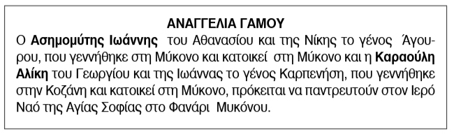 Αναγγελία γάμου για Ασημομύτη Ιωάννη και Καραούλη Αλίκη Τρίτη 29 Αυγούστου 2023 - 14:55 Συντάκτης: Ρένα Ρούσσου Κείμενο Βλέπε εικόνα. Αριθμός Φύλλου 6192 Κατηγορία Αναγγελία Γάμου