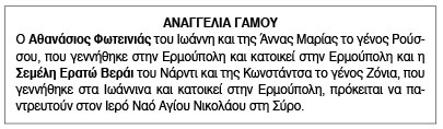 Αναγγελία γάμου για Αθανάσιο Φωτεινιά και Σεμέλη Ερατώ Βεράι Τρίτη 13 Μαΐου - 14:43 Συντάκτης: Ρένα Ρούσσου Κείμενο Βλέπε εικόνα. Αριθμός Φύλλου 6606 Κατηγορία Αναγγελία Γάμου