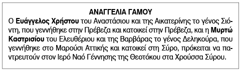 Αναγγελία γάμου για Ευάγγελο Χρήστου και Μυρτώ Καστρισίου Τετάρτη 9 Αυγούστου 2023 - 17:59 Συντάκτης: Ρένα Ρούσσου Κείμενο Βλέπε εικόνα. Αριθμός Φύλλου 6184 Κατηγορία Αναγγελία Γάμου