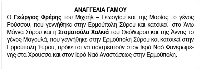 Αναγγελία Γάμου για Φρέρη Γεώργιο και Σταματούλα Χαλκιά Πέμπτη 26 Ιουνίου - 14:05 Συντάκτης: Ρένα Ρούσσου Κείμενο Βλέπε εικόνα. Αριθμός Φύλλου 6637 Κατηγορία Αναγγελία Γάμου