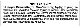Αναγγελία γάμου για Γεώργιο Μπακατσέλο και Γεωργία Ρούσσου Παρασκευή 2 Φεβρουαρίου 2024 - 14:49 Συντάκτης: Ρένα Ρούσσου Κείμενο Βλέπε εικόνα. Αριθμός Φύλλου 6300 Κατηγορία Αναγγελία Γάμου