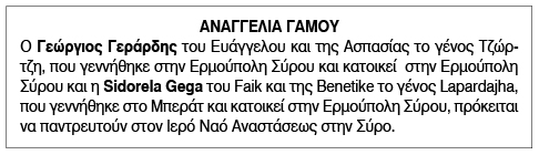 Αναγγελία γάμου για Γεράρδη Γεώργιο και Sidorela Gega Δευτέρα 11 Σεπτεμβρίου 2023 - 15:28 Συντάκτης: Ρένα Ρούσσου Κείμενο Βλέπε εικόνα. Αριθμός Φύλλου 6201 Κατηγορία Αναγγελία Γάμου