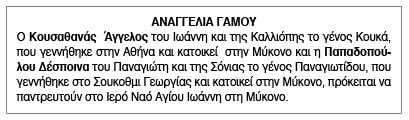 Αναγγελία γάμου για Κουσαθανά Άγγελο και Παπαδοπούλου Δέσποινα Πέμπτη 14 Σεπτεμβρίου 2023 - 14:20 Συντάκτης: Ρένα Ρούσσου Κείμενο Βλέπε εικόνα. Αριθμός Φύλλου 6204 Κατηγορία Αναγγελία Γάμου