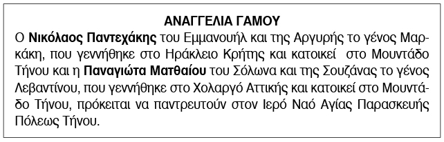 Αναγγελία Γάμου για Νικόλαο Παντεχάκη και Παναγιώτα Ματθαίου Τετάρτη 17 Ιανουαρίου 2024 - 13:28 Συντάκτης: Ρένα Ρούσσου Κείμενο Βλέπε εικόνα. Αριθμός Φύλλου 6288 Κατηγορία Αναγγελία Γάμου