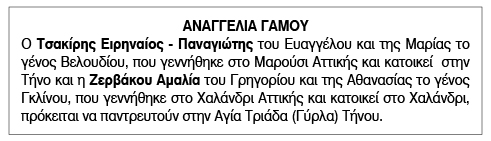 Αναγγελία γάμου για Τσακίρη Ειρηναίο - Παναγιώτη και Ζερβάκου Αμαλία Τετάρτη 28 Μαΐου - 13:45 Συντάκτης: Ρένα Ρούσσου Κείμενο Βλέπε εικόνα. Αριθμός Φύλλου 6617 Κατηγορία Αναγγελία Γάμου