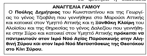 Αναγγελία Γάμου Πούλης - Ξανθάκη Δευτέρα 23 Απριλίου 2018 - 12:16 Συντάκτης: Κατερίνα Βιδάλη Κείμενο Βλέπε εικόνα Αριθμός Φύλλου 4861 Κατηγορία Αναγγελία Γάμου
