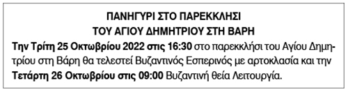 Ανακοίνωση για το Πανηγύρι στο Παρεκκλήσι του Αγίου Δημητρίου στη Βάρη Δευτέρα 24 Οκτωβρίου 2022 - 15:26 Συντάκτης: Ρένα Ρούσσου Κείμενο Βλέπε εικόνα. Αριθμός Φύλλου 5987 Κατηγορία Ανακοίνωση