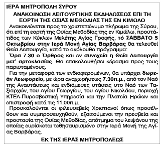 Ανακοίνωση λειτουργικής εκδήλωσης επί τη εορτή της Οσίας Μεθοδίας της εν Κιμωλω Πέμπτη 3 Οκτωβρίου 2019 - 13:42 Συντάκτης: Πέννυ Συριανού Κείμενο Βλέπε εικόνα Αριθμός Φύλλου 5224 Κατηγορία Ανακοίνωση