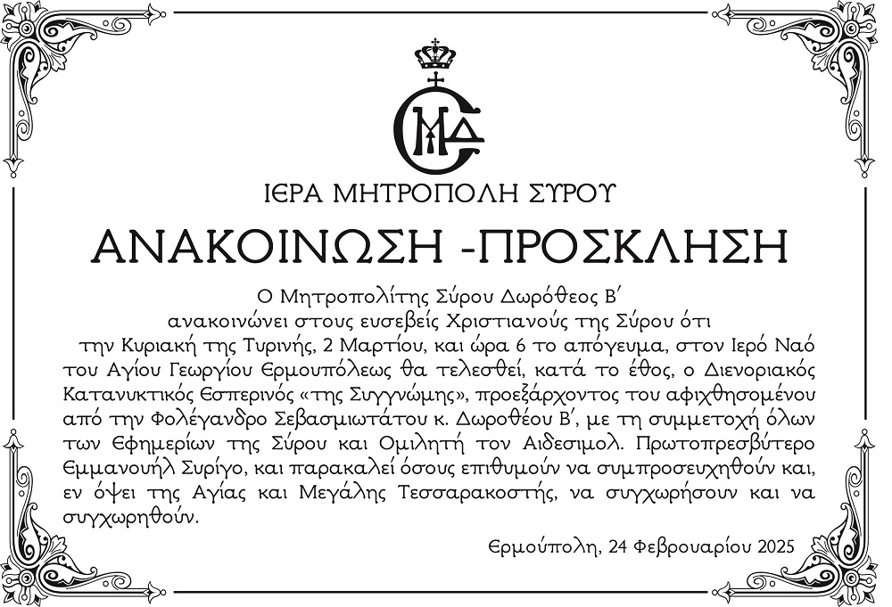 Ανακοίνωση - Πρόσκληση Τυρίνης εσπερινός συγνώμης 2025 Πέμπτη 27 Φεβρουαρίου - 13:52 Συντάκτης: Ρένα Ρούσσου Κείμενο Βλέπε εικόνα. Αριθμός Φύλλου 6559 Κατηγορία Ανακοίνωση