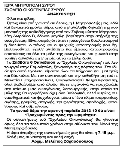 Ανακοίνωση Σχολείο Οικογένειας Παρασκευή 5 Οκτωβρίου 2018 - 12:25 Συντάκτης: Κατερίνα Βιδάλη Κείμενο Βλέπε εικόνα Αριθμός Φύλλου 4977 Κατηγορία Ανακοίνωση