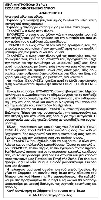 Ανακοίνωση Σχολείου οικογένειας για το μήνα Ιούνιο της Ιεράς Μητρόπολης Παρασκευή 31 Μαΐου 2019 - 15:17 Συντάκτης: Πέννυ Συριανού Κείμενο Βλέπε εικόνα Αριθμός Φύλλου 5137 Κατηγορία Ανακοίνωση