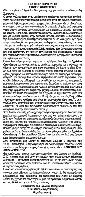 Ανακοίνωση Σχολείου οικογένειας Μάρτιος 2025, από την Ιερά Μητρόπολη Σύρου