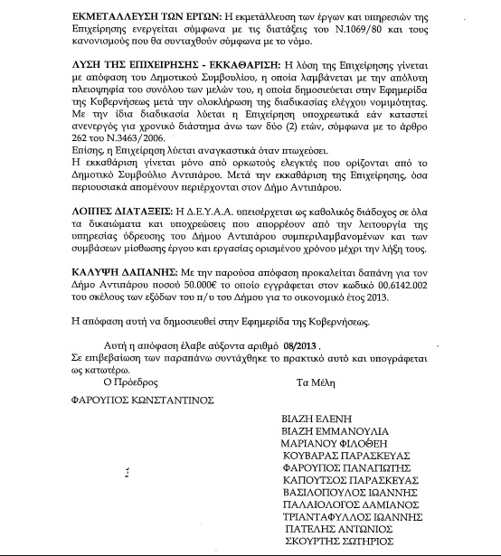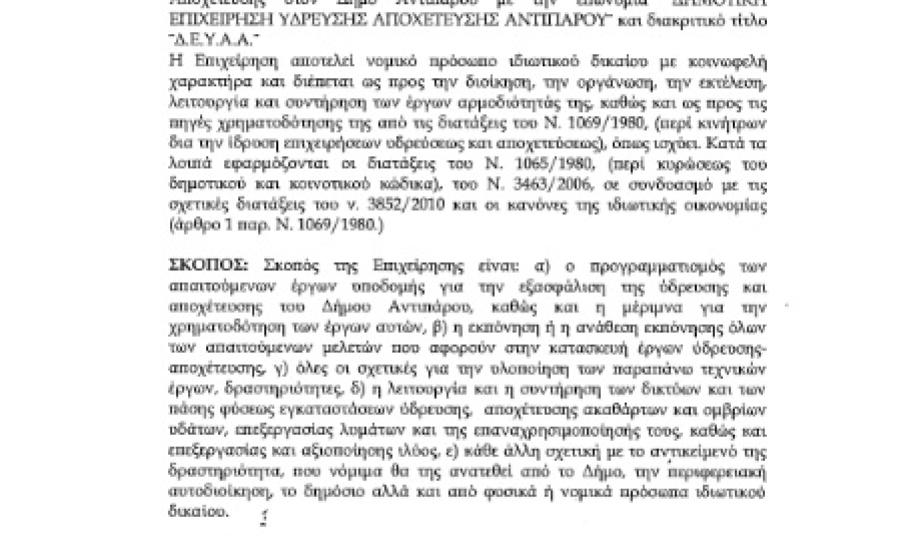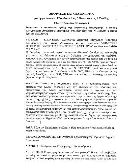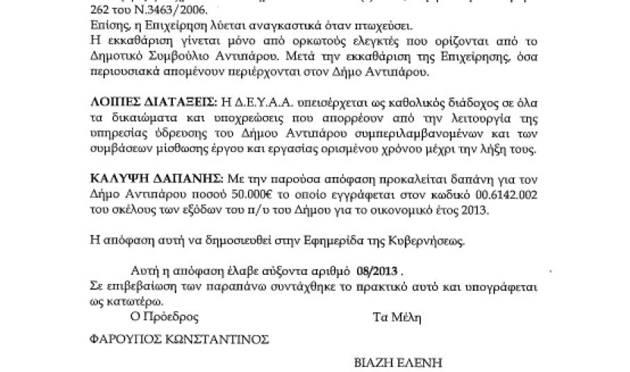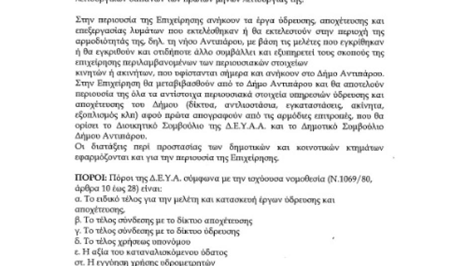 Η ανησυχία μου πλέον μεγάλωσε! Κάνεις δεν ανέφερε ότι η Δ.Ε.Υ.Α. Αντιπάρου έπρεπε να λειτουργήσει πριν δυο χρόνια. Όμως οι διαδικασίες λειτουργιάς, έπρεπε να είχαν ξεκινήσει. Σήμερα 27-08-2015 είναι η τελευταία μέρα ύπαρξης της Συσταθείσας και Ιδρυθείσας Δημοτικής Επιχείρησης Ύδρευσης και Αποχέτευσης Δήμου Αντιπάρου. Από αύριο η Δ.Ε.Υ.Α.Α. λύεται. Δυστυχώς πέρασαν δυο έτη και έμεινε ανενεργή. Οι προθεσμίες χάθηκαν. Ο Νόμος είναι ξεκάθαρος και δεν υπάρχουν περιθώρια ερμηνείας, όπως κάποιοι προσπαθούν να περάσουν.