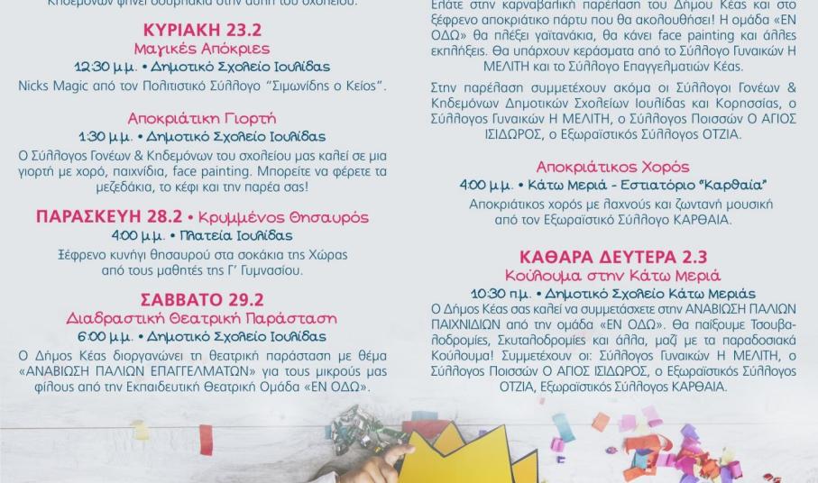 Την Τσικνοπέμπτη θα τσικνίσουμε και θα διασκεδάσουμε στο πάρτυ του Δημοτικού Σχολείου Κορησσίας. Στις 23 Φεβρουαρίου θα απολαύσουμε μια παράσταση μαγικών, αλλά και την αποκριάτικη γιορτή στο Δημοτικό Σχολείο Ιουλίδας. Στις 28 Φεβρουαρίου ψάχνουμε στην Ιουλίδα τον κρυμμένο θησαυρό και στις 29 Φεβρουαρίου συμμετέχουμε στην αναβίωση παλιών επαγγελμάτων στο Δημοτικό Σχολείο Ιουλίδας. Την Κυριακή 1 Μαρτίου διασκεδάζουμε με την ψυχή μας στην αποκριάτικη παρέλαση και στο ξέφρενο πάρτυ που θα ακολουθήσει στην Πλατεία της Ιουλίδας. Αργότερα χορεύουμε στην Κάτω Μεριά με ζωντανή μουσική. Την Καθαρά Δευτέρα, 2 Μαρτίου, γιορτάζουμε τα Κούλουμα και παίζουμε παιχνίδια όπως παλιά στην Κάτω Μεριά.