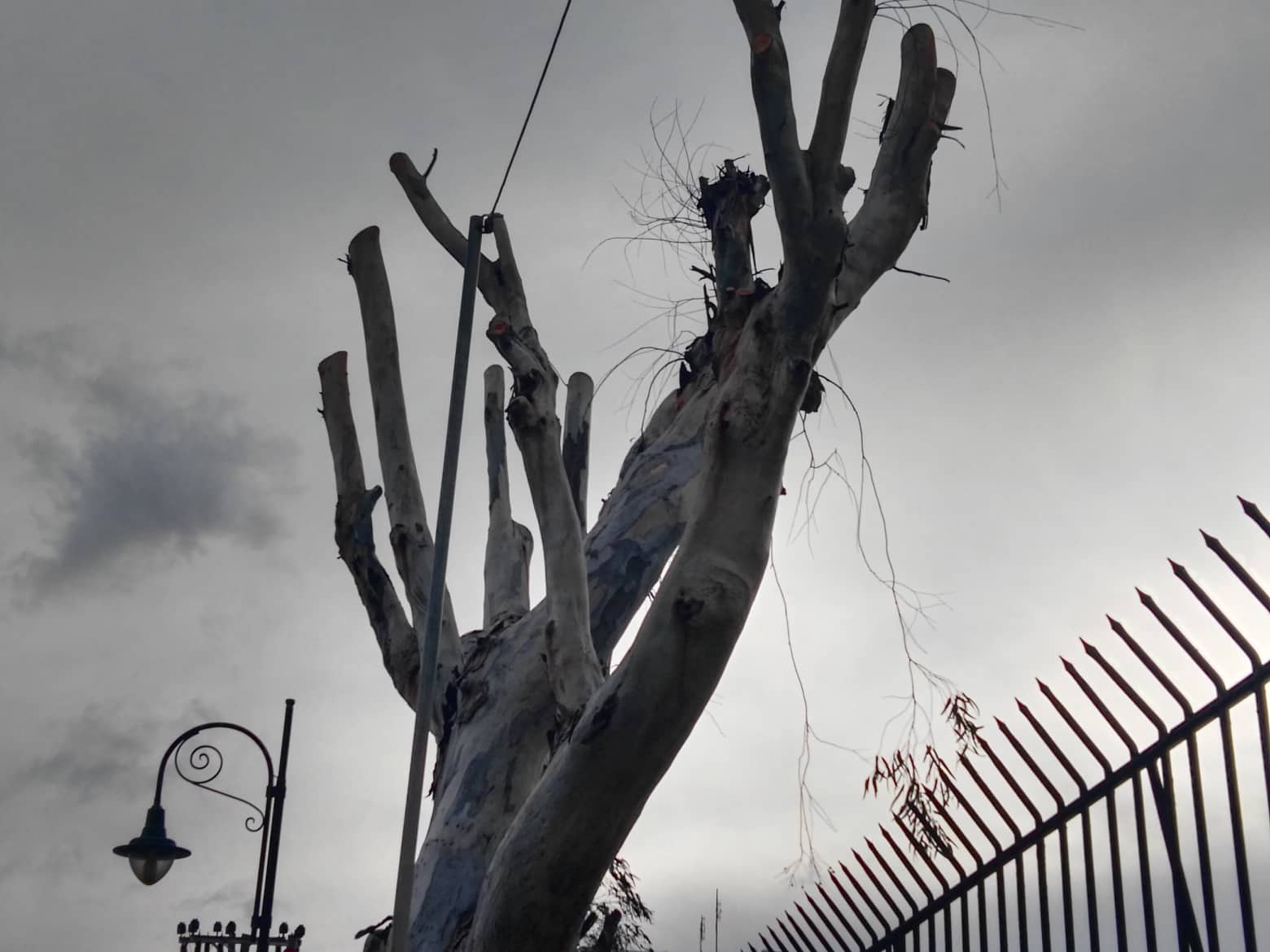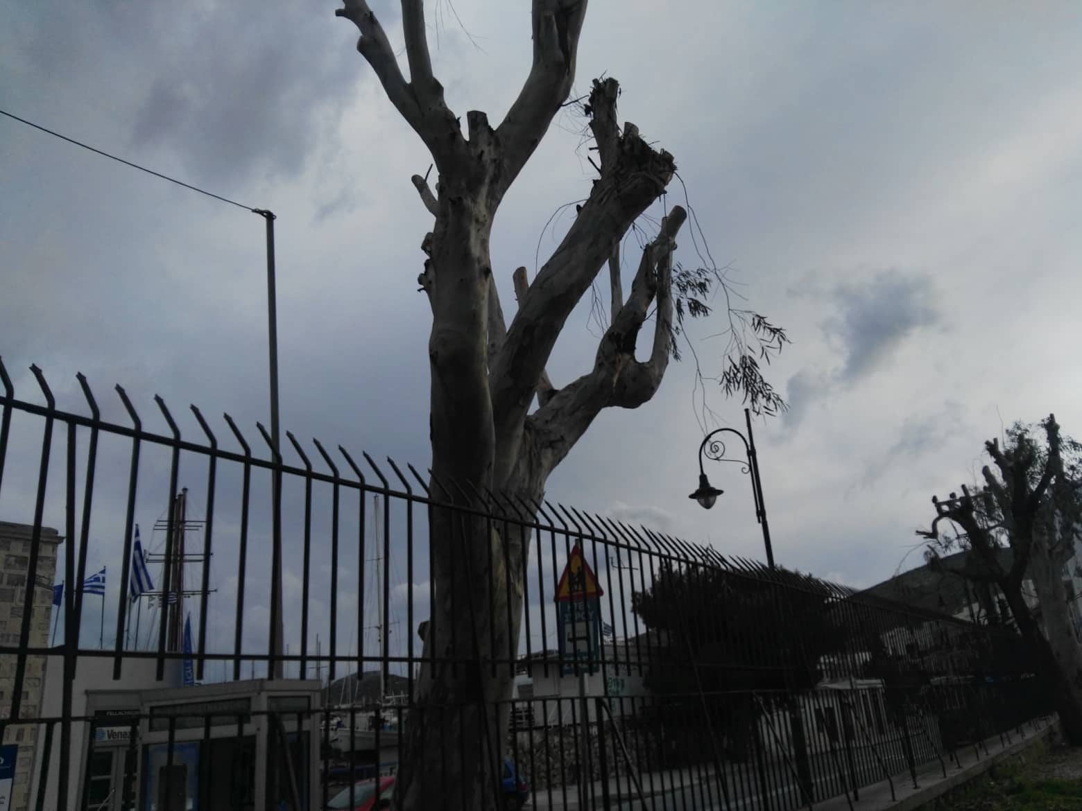 Κλαδιά που είχαν αποκτήσει μεγάλη κλίση κι έτειναν να αποκολληθούν πλήρως από τα δέντρα που περιστοιχίζουν το μισό τμήμα της αυλής του Σχολείου, αφαιρέθηκαν με προσοχή από τους εργάτες καθαριότητας του Δήμου Σύρου – Ερμούπολης, ώστε να μην κινδυνεύσει κανένας μαθητής.
