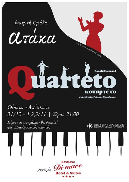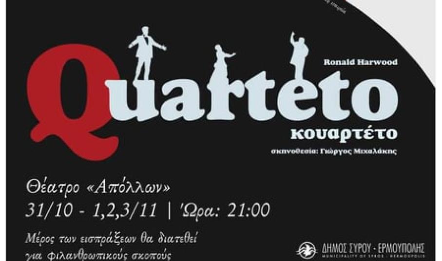 Με το «Κουαρτέτο» του Ronald Harwood, συγγραφέα του διαχρονικού «Αμπιγιέρ», θα συστηθεί στο κοινό της Σύρου μία νέα θεατρική ομάδα, αποτελούμενη από ερασιτέχνες ηθοποιούς που γνωρίσαμε και αγαπήσαμε μέσα από την πολυετή συμμετοχή τους σε άλλο τοπικό σχήμα.