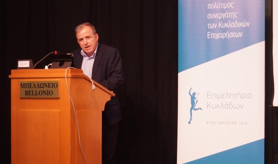 Ενημέρωσε πως σε Θήρα και Θηρασιά λειτουργούν 4.500 επιχειρήσεις απασχολώντας περί τους 22.000 εργαζόμενους, ενώ επεσήμανε ότι η τοπική επιχειρηματικότητα ενισχύεται σε μεγάλο βαθμό από τους επισκέπτες της κρουαζιέρας, εκφράζοντας παράλληλα την αγωνία του για την υφιστάμενη κατάσταση και επισημαίνοντας τις τοπικές ιδιαιτερότητες της κρουαζιέρας και διατυπώνοντας την ανάγκη αύξησης του βαθμού απόδοσης της κρουαζιέρας προς όφελος των επιχειρηματιών της Σαντορίνης.
