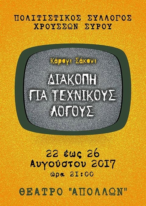 Το επίκαιρο έργο του Κάρογι Σάκονι, «Διακοπή για τεχνικούς λόγους» που γράφτηκε το 1970 ως ένα σχόλιο του συγγραφέα στον τρόπο ζωής της ουγγρικής κοινωνίας, παρουσιάστηκε για πρώτη φορά στη Σύρο το 1990 από τον Θεατρικό Όμιλο «Σουρή», ο οποίος λόγω των εργασιών αποκατάστασης του Θεάτρου Απόλλων, πραγματοποίησε τις παραστάσεις του στην Ενοριακή Αίθουσα του Αγίου Σεβαστιανού στην Άνω Σύρο.