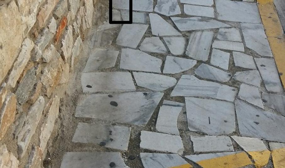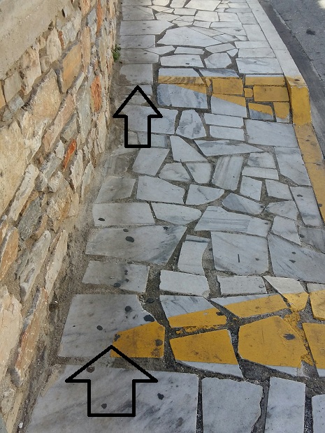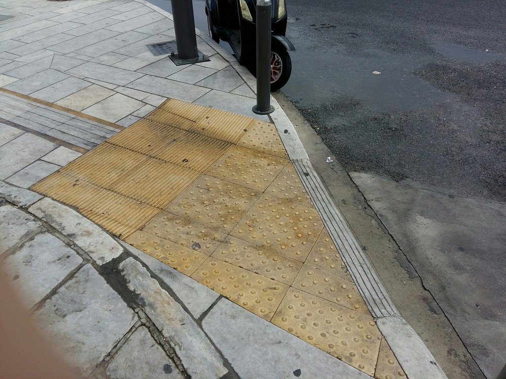 2) Να επισημάνω ότι ουσιαστικά είναι μια επικλινής «ράμπα» για την οποία έχουν χρησιμοποιηθεί οι ίδιες πλάκες που χρησιμοποιούνται και για την πεζοδρόμηση!!!!! Δηλαδή δεν έχει το προβλεπόμενο αντιολισθητικό υλικό όπως έχουν άλλες ράμπες π.χ αυτή που βρίσκεται εμπρός ακριβώς από την επιχείρηση ΒΗΧΟΣ και η οποία κατά την γνώμη μου κατασκευαστικά ορθή.