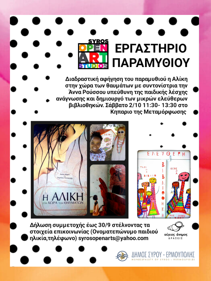 Το πρωί του Σαββάτου 2 Οκτωβρίου, από 11:30 έως 13:30 θα πραγματοποιηθεί στο Κηπάριο μία διαδραστική αφήγηση του παραμυθιού "Η Αλίκη στην χώρα των θαυμάτων" με συντονίστρια την Άννα Ρούσσου, υπεύθυνη της παιδικής λέσχης ανάγνωσης και δημιουργό των μικρών ελεύθερων βιβλιοθηκών. Τις ίδιες ώρες, η καλλιτεχνική ομάδα «Μουτζούρες» θα ζωγραφίσει στα πρόσωπα των μικρών της φίλων ό,τι βάζει ο νους τους. Face-painting θα πραγματοποιηθεί και το πρωί της Κυριακής (12:00-13:30) στο Belle epoque bistro, στην Πλατεία Μιαούλη.