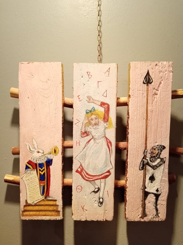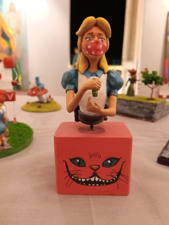 Η σύνδεση μεταξύ των δύο αυτών πρωτόγνωρων κόσμων ενέπνευσε την ομάδα καλλιτεχνών των Syros Open Art Studios για τη δημιουργία της πολυμορφικής εικαστικής έκθεσης "Alice ín Covid- land”, η οποία παρουσιάζεται στην Αίθουσα Εμμανουήλ Ροΐδη του Πνευματικού Κέντρου Ερμούπολης.