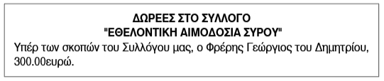 Δωρεές στο Σύλλογο Εθελοντικής Αιμοδοσίας Σύρου Πέμπτη 2 Ιανουαρίου - 10:31 Συντάκτης: Ρένα Ρούσσου Κείμενο Βλέπε εικόνα Αριθμός Φύλλου 6519 Κατηγορία Δωρεές