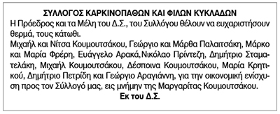 Δωρεές στο Σύλλογο Καρκινοπαθών και Φίλων Κυκλάδων Παρασκευή 17 Ιουνίου 2022 - 14:14 Συντάκτης: Ρένα Ρούσσου Κείμενο Βλέπε εικόνα. Αριθμός Φύλλου 5897 Κατηγορία Δωρεές