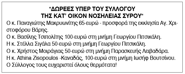 Δωρεές υπέρ του Συλλόγου της Κατ' Οίκον Νοσηλείας Σύρου Τρίτη 13 Ιουνίου 2023 - 14:48 Συντάκτης: Ρένα Ρούσσου Κείμενο Βλέπε εικόνα. Αριθμός Φύλλου 6143 Κατηγορία Δωρεές