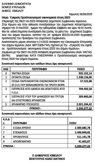 Έγκριση του προϋπολογισμού εσόδων και δαπανών οικονομικού έτους 2023, από το Δήμο Κιμώλου Πέμπτη 8 Ιουνίου 2023 - 15:00 Συντάκτης: Ρένα Ρούσσου Κείμενο Βλέπε εικόνα. Αριθμός Φύλλου 6140 Κατηγορία Προϋπολογισμοί
