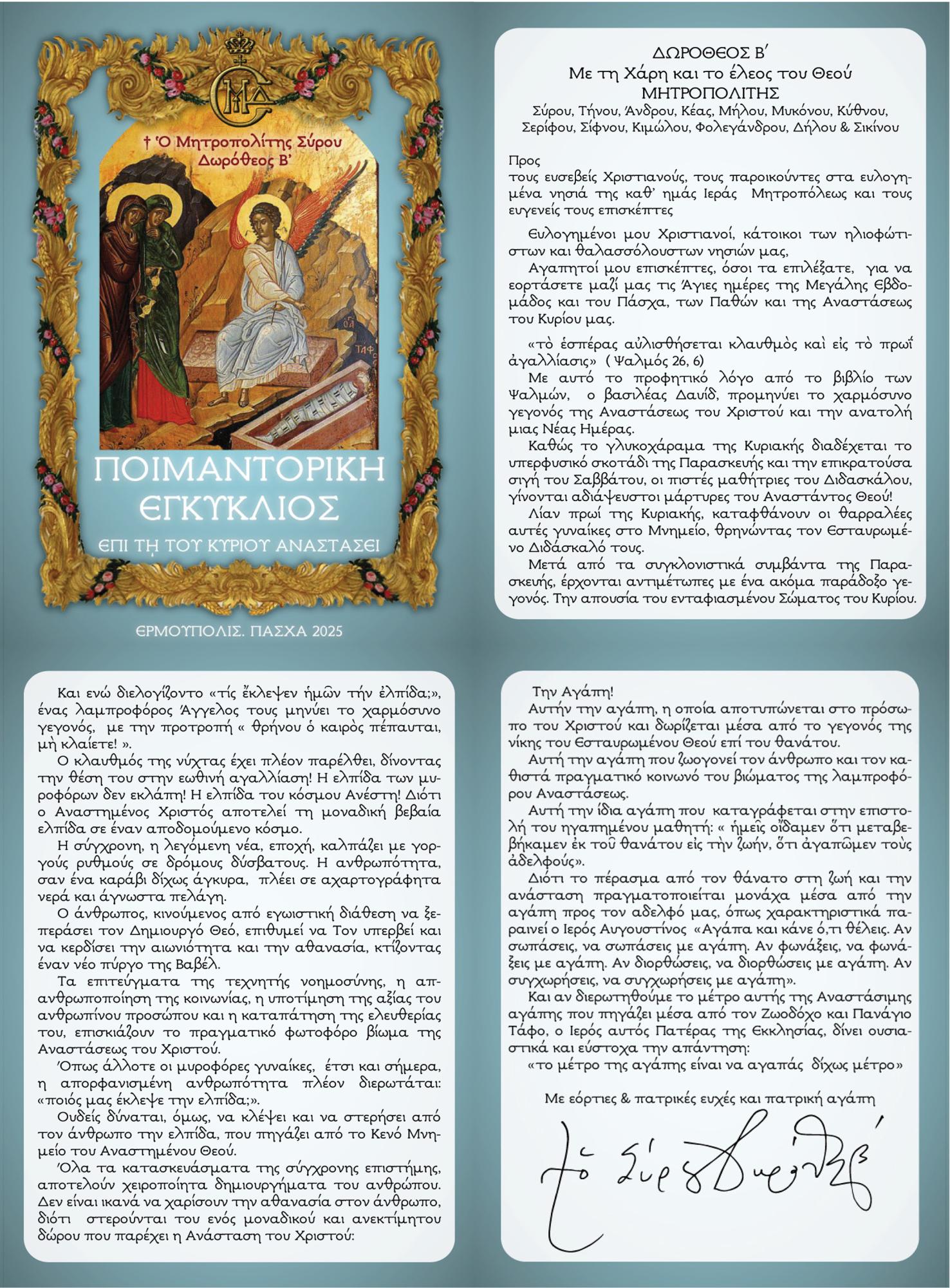 Εγκύκλιος Πάσχα 2025, από την Ιερά Μητρόπολη Σύρου Πέμπτη 17 Απριλίου - 13:53 Συντάκτης: Ρένα Ρούσσου Κείμενο Βλέπε εικόνα. Αριθμός Φύλλου 6591 Κατηγορία Ανακοίνωση