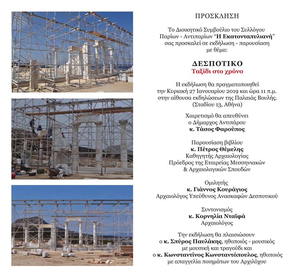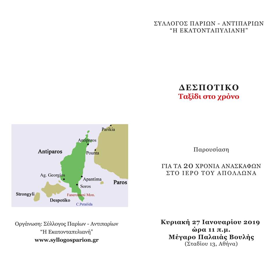 Εκδήλωση για τα 20 χρόνια ανασκαφών στο Δεσποτικό, διοργανώνει ο Σύλλογος Παρίων - Αντιπαρίων "Εκατονταπυλιανή", στο Μέγαρο της Παλαιάς Βουλής στην Αθήνα.