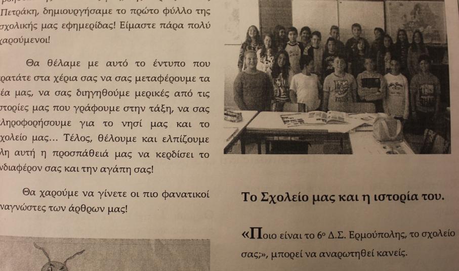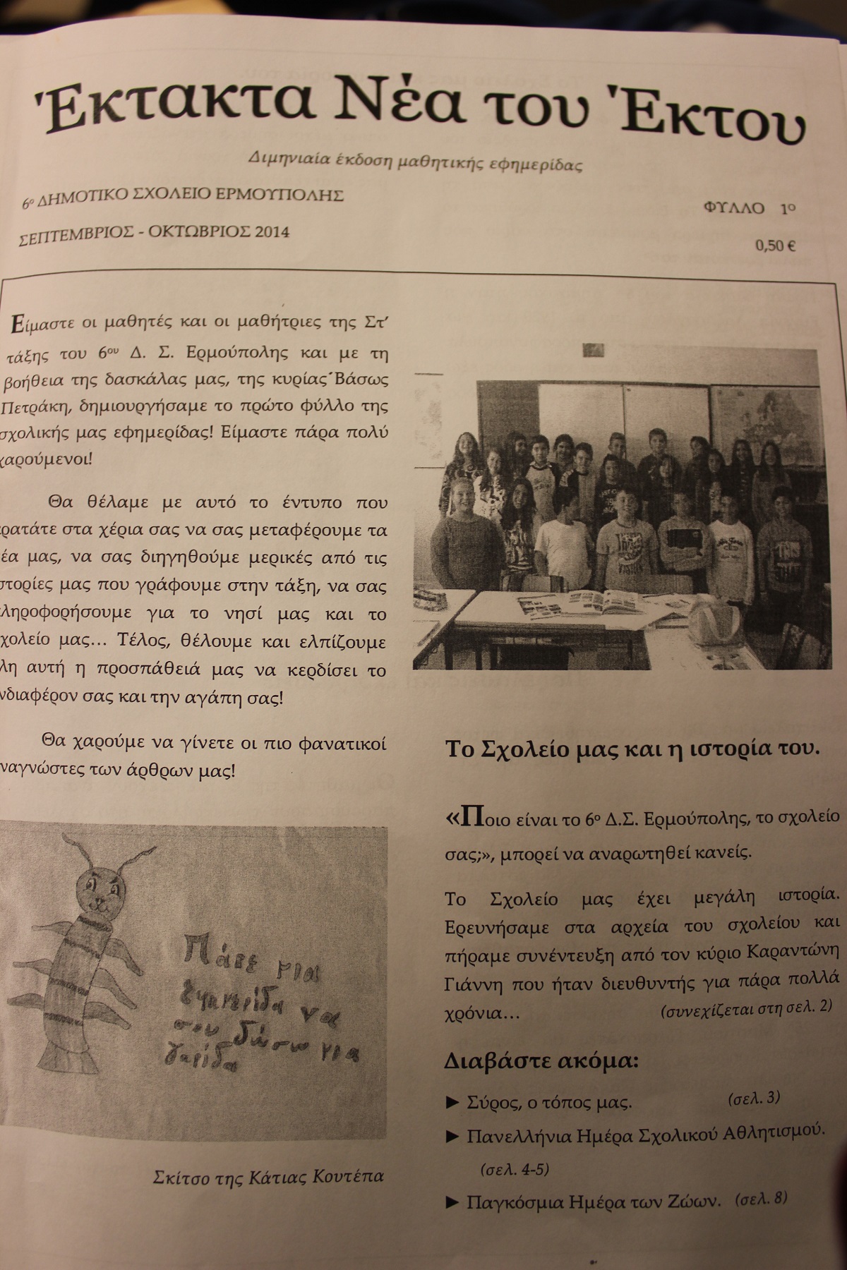 Ερευνούν, μαθαίνουν, σκέφτονται δημιουργικά και διατυπώνουν τις προσωπικές τους απόψεις μέσα από τη δική τους εφημερίδα. Κάθε δύο μήνες, οι μαθητές της ΣΤ' Τάξης του 6ου Δημοτικού Σχολείου Ερμούπολης διαλαλούν τα “έκτακτα νέα” τους, διηγούνται μερικές από τις ιστορίες τους και πληροφορούν τους αναγνώστες για το νησί και το σχολείο τους.