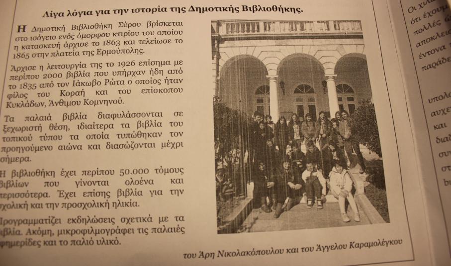 Ανάμεσα στους χώρους που επισκέφτηκαν οι μαθητές κατά τη διάρκεια της χρονιάς ήταν το Βιομηχανικό Μουσείο Ερμούπολης και η Δημοτική Βιβλιοθήκη. Εκεί, τα παιδιά άντλησαν σημαντικές πληροφορίες για την ιστορία της γραφής, που αρχίζει από την εποχή των σπηλαίων, τότε που οι άνθρωποι ζωγράφιζαν πάνω σε πλάκες τα ζώα που ήθελαν να κυνηγήσουν ή που είχαν κυνηγήσει. Η γραφή συνεχίστηκε από τους Αιγυπτίους, όπου έβαζαν και διάφορα σύμβολα μαζί με διάφορες ζωγραφιές πάνω στις πυραμίδες των Φαραώ. Το άρθρο υπέγραψαν ο Άρης Νικολακόπουλος και ο Άγγελος Καραμολέγκος.