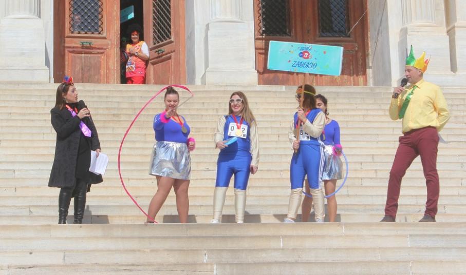 Στη συνέχεια, η Μαριάννα Βακονδίου και ο Γιώργος Ρούσσος που κάθε χρόνο επιστρατεύουν το κέφι και το χιούμορ τους για να μας μεταφέρουν κάθε χαρούμενη στιγμή του Συριανού Καρναβαλιού, υποδέχτηκαν στα σκαλιά του Δημαρχιακού Μεγάρου τους εκπροσώπους των φετινών καρναβαλικών ομάδων.
