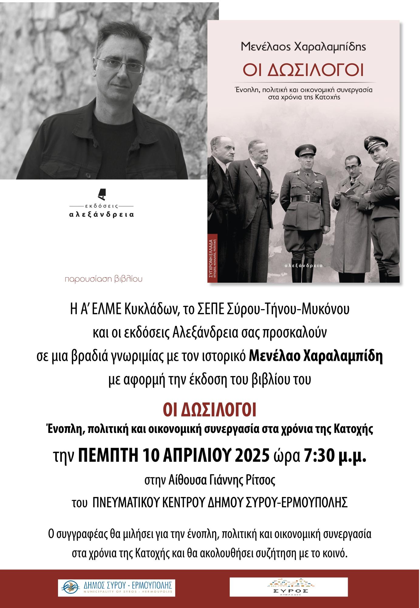 Η Α΄ ΕΛΜΕ ΚΥΚΛΑΔΩΝ καλεί όλους τους εκπαιδευτικούς στην παρουσίαση του βιβλίου "ΟΙ ΔΩΣΙΛΟΓΟΙ" στις 10 Απρίλη, στην αίθουσα Ιωάννη Ρίτσου του Πνευματικού Κέντρου του Δήμου Σύρου-Ερμούπολης.