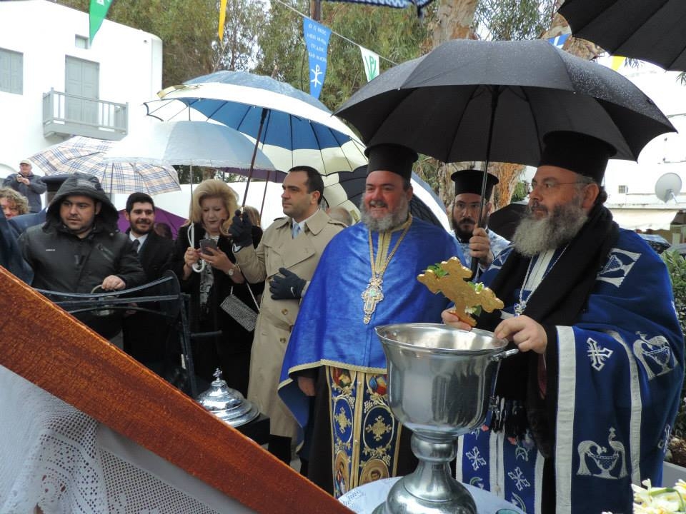 Με λαμπρότητα και κάθε επισημότητα τελέσθηκαν τα Θεοφάνεια στη Μύκονο, παρά το τσουχτερό κρύο και την κακοκαιρία. Μετά τη Θεία Λειτουργία και Ακολουθία στην Ιερά Μητρόπολη του νησιού και τον Αγιασμό στα Τρία Πηγάδια, οι Ιερείς και κόσμος συνέχισαν την πομπή ως τον Άγιο Νικόλαο της Καδένας, όπου κάποιοι θαρραλέοι νεαροί, αψήφησαν το κρύο και βούτηξαν στη θάλασσα για να πιάσουν το Σταυρό.