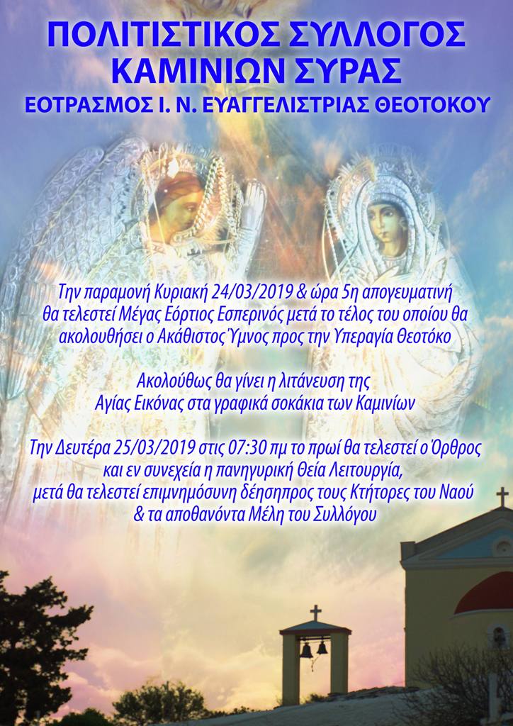 Στους εκκλησιαστικούς εορτασμούς για τη μεγάλη γιορτή τους Ευαγγελισμού της Θεοτόκου καλεί ο Πολιτιστικός και Μορφωτικός Σύλλογος Καμινίων, στις 24 Μαρτίου, στον Ι.Ν. Ευαγγελίστριας Θεοτόκου.