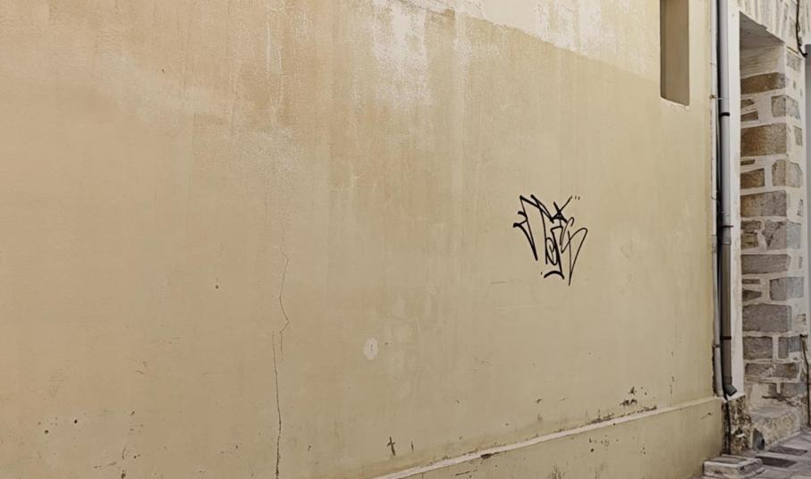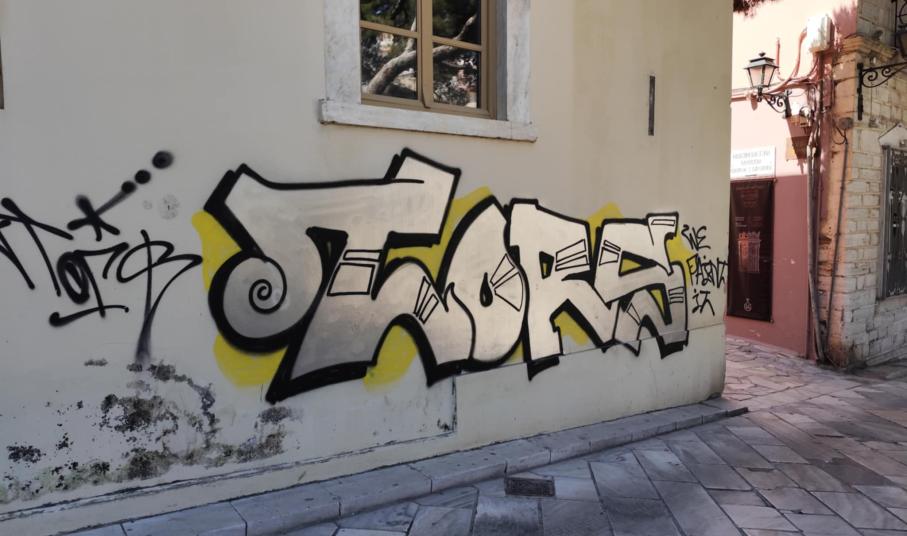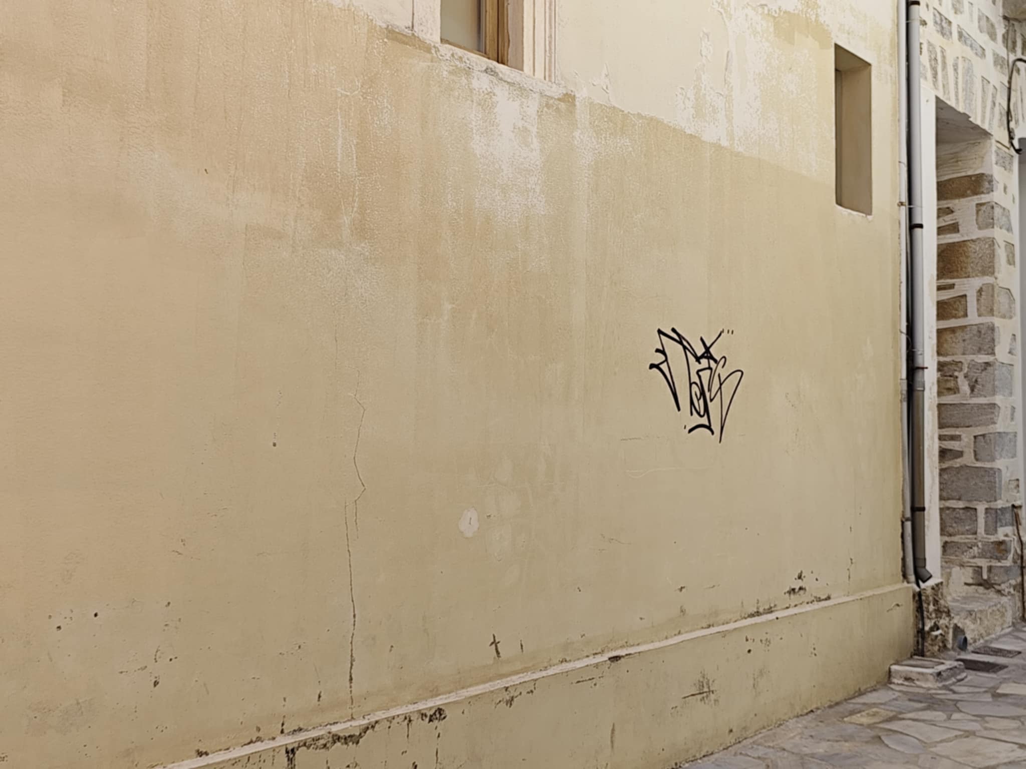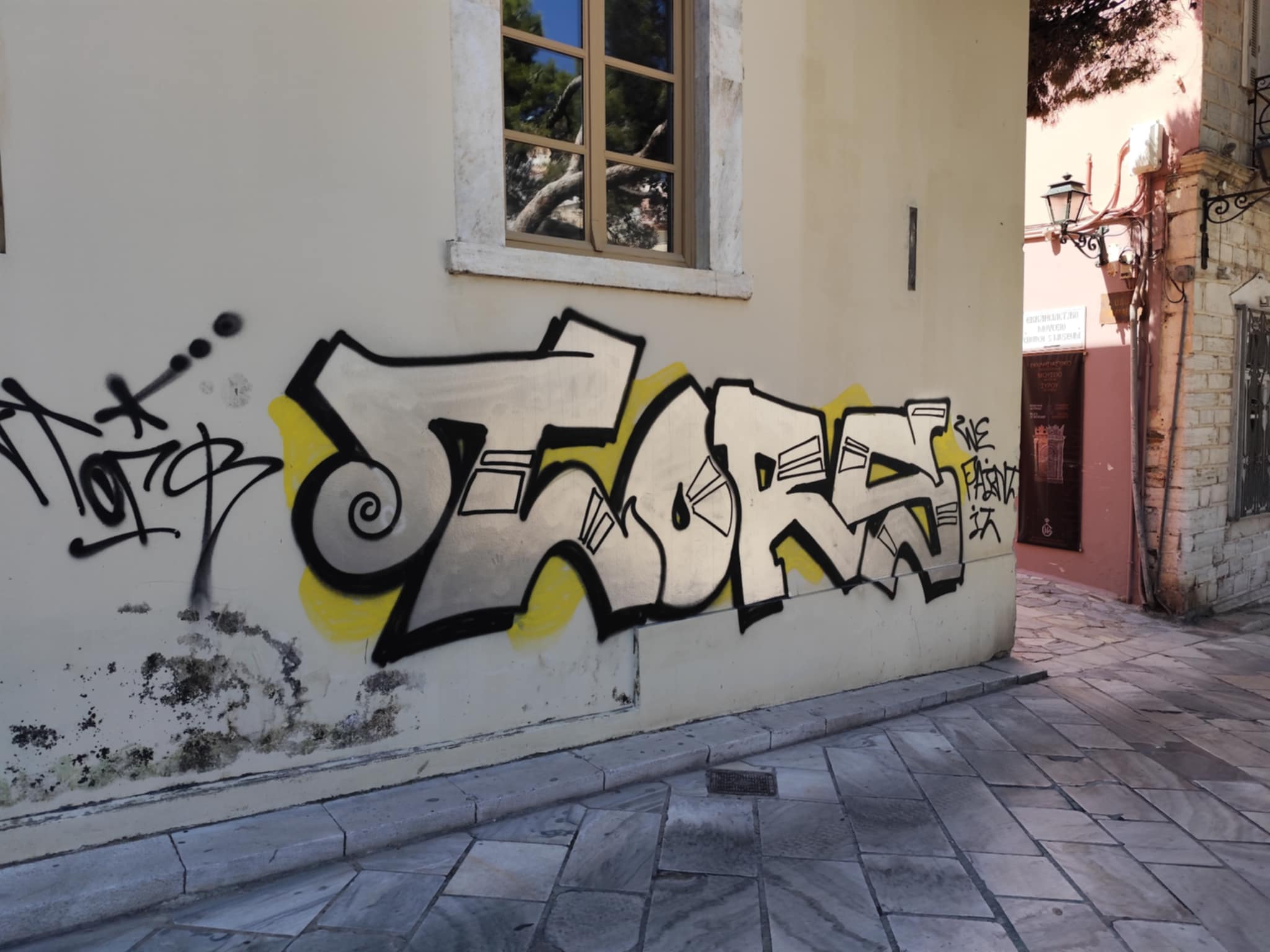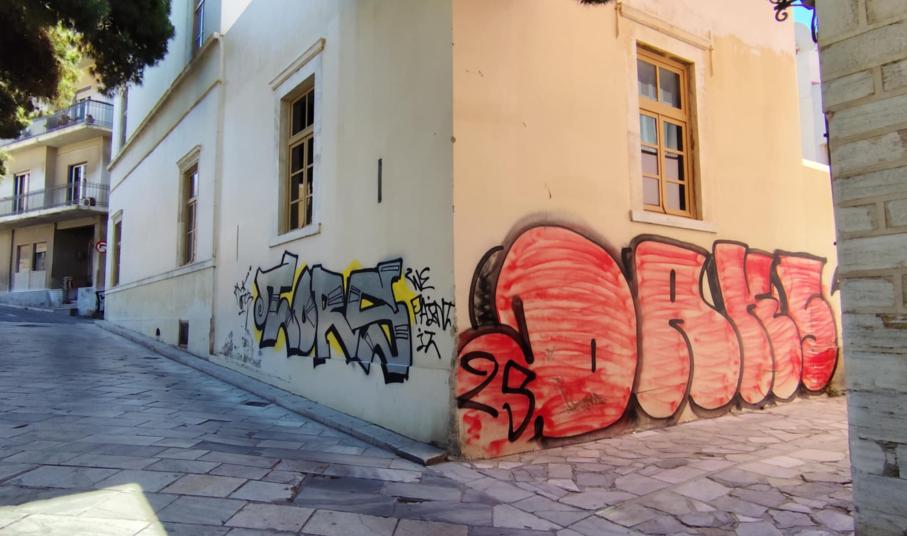 Ειδικότερα, με σπρέι βάφτηκαν δύο μεγάλα τμήματα τοίχων, τόσο προς την πλευρά του Εκκλησιαστικού Μουσείου Ερμούπολης, όσο και προς τον δρόμο της ανόδου που οδηγεί προς τον ναό του Αγίου Νικολάου.