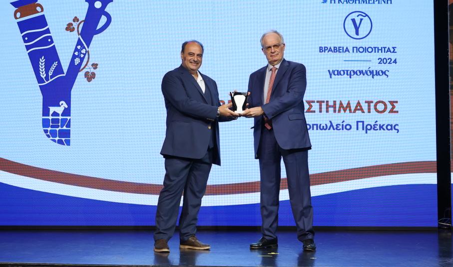 Το πρώτο βραβείο της εκδήλωσης απονεμήθηκε σε έναν Συριανό επιχειρηματία, τον Κώστα Πρέκα, ο οποίος παρέλαβε από τα χέρια του προέδρου της Βουλής, κ. Τασούλα, το "Βραβείο Καταστήματος", καθώς σύμφωνα με τον "Γαστρονόμο" η συγκεκριμένη επιχείρηση, που για 32 ολόκληρα χρόνια σηκώνει τη "σημαία" της τοπικότητας, αποτελεί μια αληθινή "κιβωτό" της Κυκλαδίτικης παραγωγής.