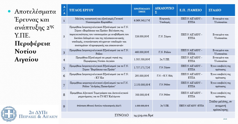 Από το Πρόγραμμα Δημοσίων Επενδύσεων και το Πρόγραμμα Ειδικού Σκοπού 2017, χρηματοδοτήθηκαν 11 έργα, με συνολικό προϋπολογισμό 4.185.253 ευρώ, μεταξύ των οποίων και το βραβευμένο με το βραβείο I.T. Exellence Gold (BITE) Εθνικό Δίκτυο Τηλεϊατρικής (ΕΔιΤ). Το δίκτυο έχει ως βασικούς στόχους την παροχή εξειδικευμένων υπηρεσιών υγείας σε τακτικά κα έκτακτα περιστατικά σε απομακρυσμένα νησιά του Αιγαίου, τη συνεχή εκπαίδευση του ιατρονοσηλευτικού προσωπικού των νησιωτικών Κέντρων Υγείας και των Πολυδύναμων Ιατρείων και τη χρήση για διοικητική υποστήριξη.