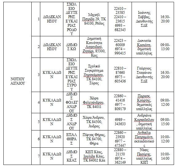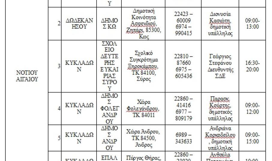 (Επισυνάπτεται αναλυτικός πίνακας των κέντρων για την Περιφέρεια Ν. Αιγαίου που δέχονται τις αιτήσεις των υποψηφίων, καθώς και οι ώρες υποβολής).
