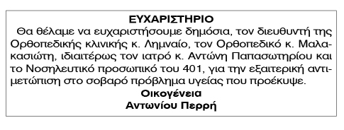 Ευχαριστήριο Αντωνίου Περρή Παρασκευή 1 Ιουνίου 2018 - 11:04 Συντάκτης: Κατερίνα Βιδάλη Κείμενο Βλέπε εικόνα Αριθμός Φύλλου 4885 Κατηγορία Ευχαριστήριο