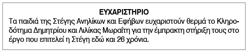 Ευχαριστήριο από τη Στέγη Ανηλίκων και Εφήβων Σύρου Πέμπτη 4 Αυγούστου 2022 - 15:03 Συντάκτης: Ρένα Ρούσσου Κείμενο Βλέπε εικόνα. Αριθμός Φύλλου 5931 Κατηγορία Ευχαριστήριο