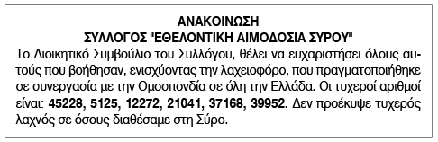 Ευχαριστήριο από την Εθελοντική Αιμοδοσία Σύρου Παρασκευή 1 Νοεμβρίου 2024 - 15:22 Συντάκτης: Ρένα Ρούσσου Κείμενο Βλέπε εικόνα. Αριθμός Φύλλου 6481 Κατηγορία Ευχαριστήριο