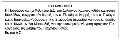 Ευχαριστήριο από το Σύλλογο Καρκινοπαθών και Φίλων Κυκλάδων Τρίτη 9 Νοεμβρίου 2021 - 15:27 Συντάκτης: Ρένα Ρούσσου Κείμενο Βλέπε εικόνα. Αριθμός Φύλλου 5747 Κατηγορία Ευχαριστήριο