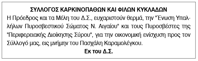 Ευχαριστήριο από το Σύλλογο Καρκινοπαθών και Φίλων Κυκλάδων Παρασκευή 1 Απριλίου 2022 - 14:38 Συντάκτης: Ρένα Ρούσσου Κείμενο Βλέπε εικόνα. Αριθμός Φύλλου 5846 Κατηγορία Ευχαριστήριο