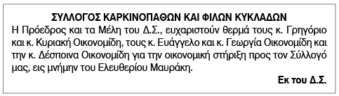 Ευχαριστήριο από το Σύλλογο Καρκινοπαθών Και Φίλων Κυκλάδων Παρασκευή 29 Απριλίου 2022 - 13:54 Συντάκτης: Ρένα Ρούσσου Κείμενο Βλέπε εικόνα. Αριθμός Φύλλου 5864 Κατηγορία Δωρεές