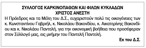 Ευχαριστήριο από τον Σύλλογο Καρκινοπαθών και φίλων Κυκλάδων Πέμπτη 28 Απριλίου 2022 - 13:09 Συντάκτης: Ρένα Ρούσσου Κείμενο Βλέπε εικόνα. Αριθμός Φύλλου 5863 Κατηγορία Ευχαριστήριο