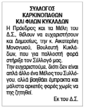 Ευχαριστήριο από τον Σύλλογο Καρκινοπαθών και φίλων Κυκλάδων Δευτέρα 31 Οκτωβρίου 2022 - 13:25 Συντάκτης: Ρένα Ρούσσου Κείμενο Βλέπε εικόνα. Αριθμός Φύλλου 5991 Κατηγορία Ευχαριστήριο